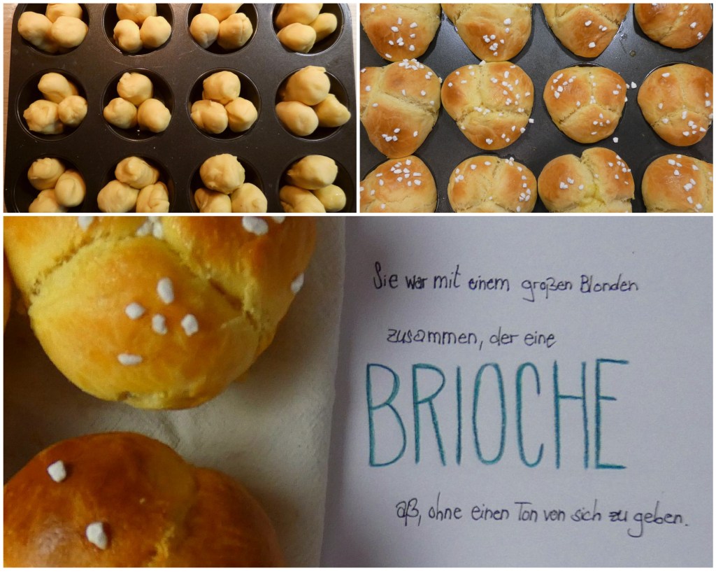 Da im Roman offenbar kleine Brioche gegessen werden, ist auch dieses Rezept auf Brötchen ausgelegt. Allerdings nicht in der ganz klassischen Brioche-Form, sondern im Muffin-Blech, da ich keine entsprechenden Formen besitze und ihr wahrscheinlich auch nicht. Man kann mit diesem Teig alternativ auch ein Brioche-Brot backen.