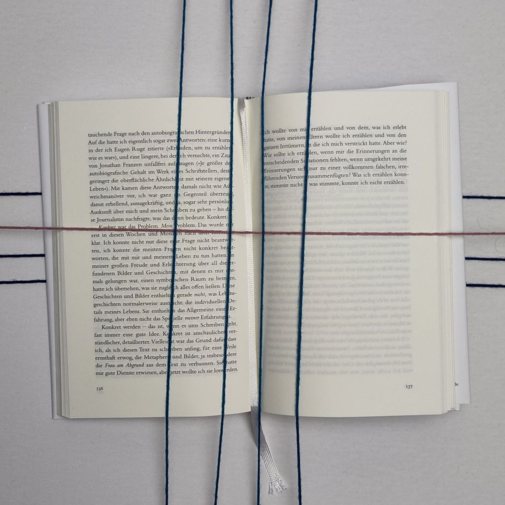 In der Auseinandersetzung damit schreibt sie selbst, liest aber auch viel, nicht nur zum Thema sexueller Missbrauch, sondern auch zu Fragen von Täterschaft und Opferstatus im allgemeinen. Sie realisiert, dass sie offenbar unbewusst seit Jahrzehnten Bücher kauft, die sich mit diesen Themen befassen, oft genug, um sie dann im Regal verstauben zu lassen. Manche schiebt sie zu Hause sogar in die zweite Regalreihe, damit sie die Auseinandersetzung damit aufschieben kann. Das Erzählen von einem Leben, das offenbar ganz anders war, fällt ihr schwer. Wie kann man auch von einem prägenden Erlebnis erzählen, wenn man nicht nur keine, sondern eine offenbar völlig falsche Erinnerung daran hat?